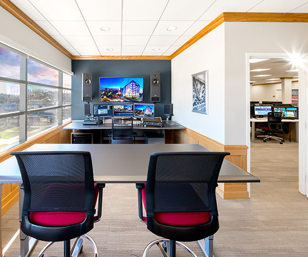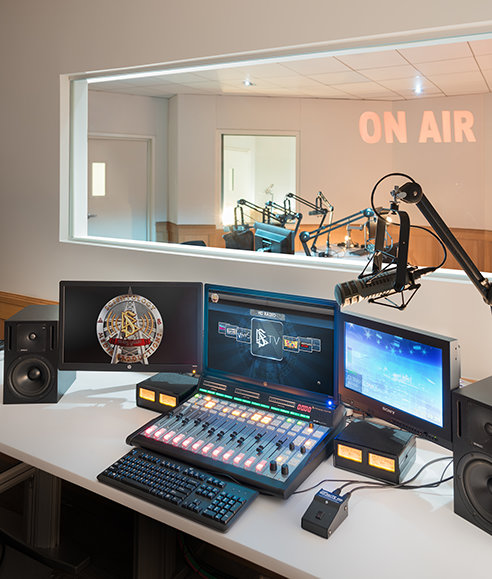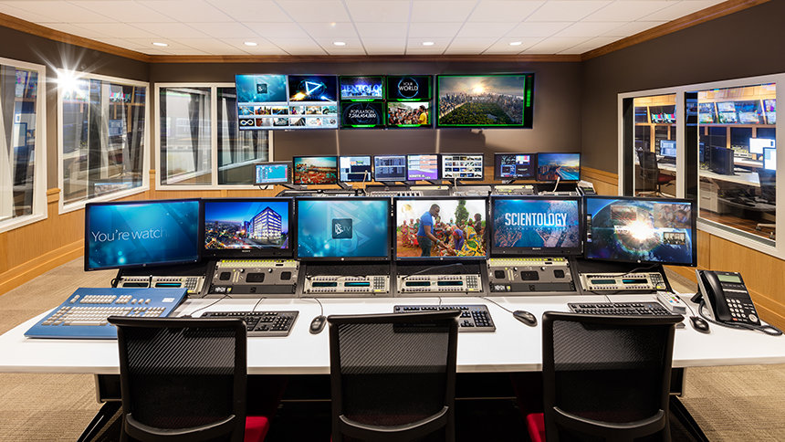 En las instalaciones administrativas centrales del estudio, la Iglesia da forma a sus mensajes para su difusión y los prepara para su distribución por televisión, radio, podcasts y todos los demás canales de los medios.