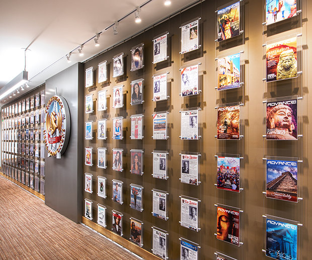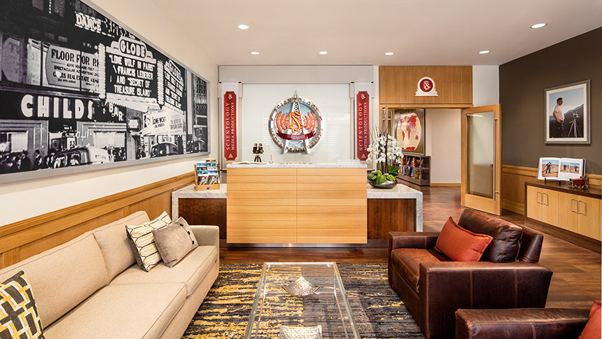 refleja la intersección de la historia de L. Ronald Hubbard y la historia de los estudios. En sus paredes están las vallas publicitarias de marquesinas de películas y series cuyos guiones escribió el Sr. Hubbard para Hollywood.
