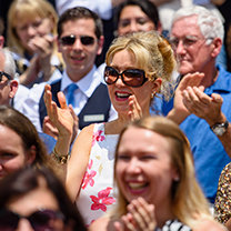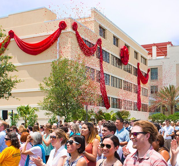 La multitud reunida fue testigo cuando las dos cintas cayeron simultáneamente para la gran inauguración del Edificio West Coast (WB) y el Edificio Administrativo de la Tripulación de Flag, anteriormente conocido como el edificio Lee Arnold.