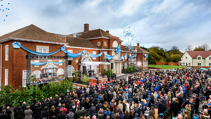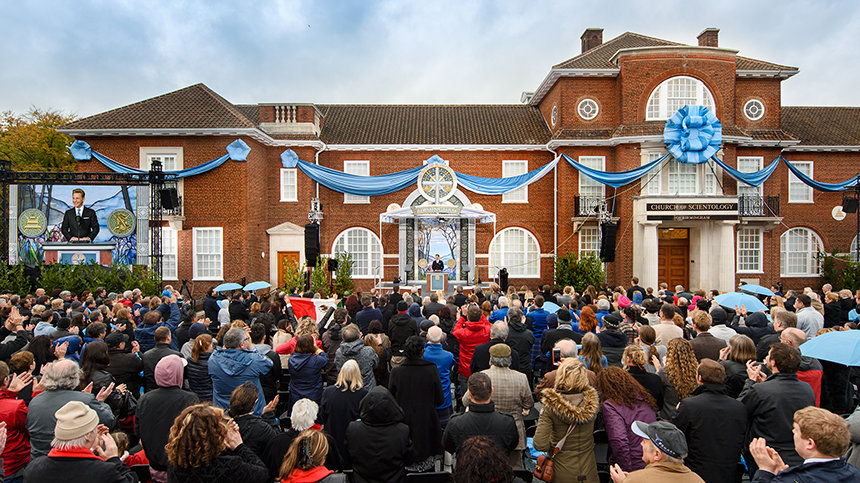 Con esto y acorde con el espíritu del día, el Sr. David Miscavige, líder eclesiástico de la religión de Scientology, proclamó: “Cuando caiga ese listón, también subirá un telón… y con eso se convierte en la responsabilidad de cada scientologist hacer que lo mejor de Inglaterra se eleve, transformando así una revolución industrial en una revolución espiritual”.
