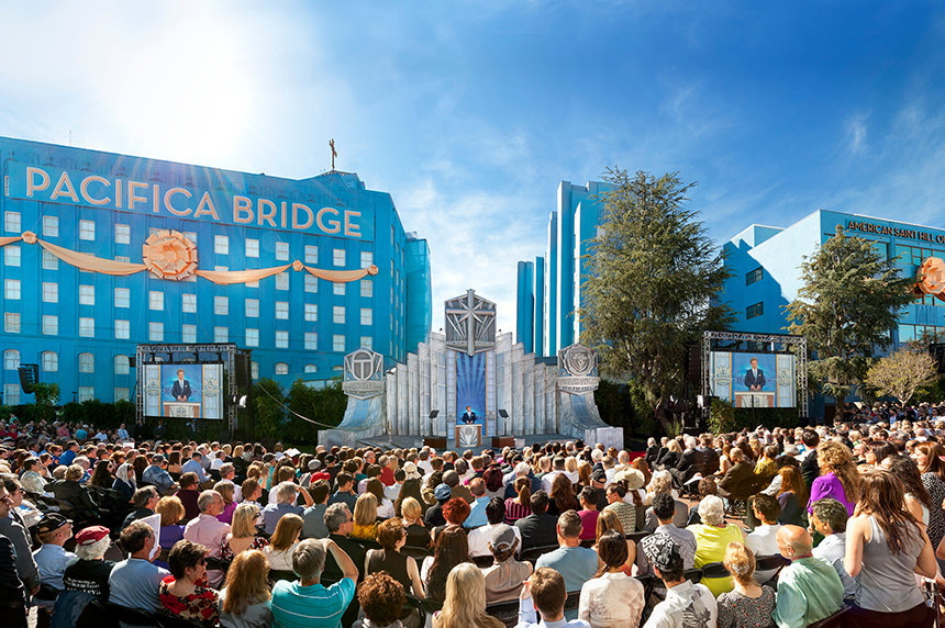 Para subrayar la importancia de la ocasión, las ceremonias de dedicatoria fueron conducidas por el Presidente de la Junta de Religious Technology Center, el Sr. David Miscavige. El Sr. Miscavige se dirigió a los scientologists asistentes diciendo: “Hoy, cumplimos la visión de L. Ronald Hubbard del Puente del Pacífico Ideal para todos los scientologists de Los Ángeles y, de hecho, de Estados Unidos. Porque aquí se encuentran los pilares físicos de un Puente que está ahora al alcance de todos en nuestra Edad de Oro: un Puente que representa el ascenso a la libertad espiritual total, un Puente que se extiende no sólo por un bulevar... sino que se extiende hasta la eternidad misma”.