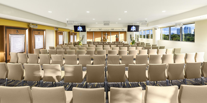 La Capilla de la nueva Iglesia de Scientology de Miami está diseñada para reuniones de la congregación que incluyen Servicios Dominicales, Bodas y Ceremonias de Nombramiento. También es el escenario perfecto para recepciones a puertas abiertas, reuniones comunitarias, almuerzos y banquetes cívicos para miembros de cualquier fe.