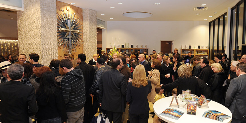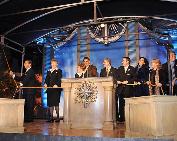 Acompañado por scientologists de la localidad que encabezaron el impulso de la construcción de la nueva Iglesia, el Sr. Miscavige cortó la cinta e invitó a todos a que entraran.