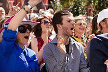 Una multitud eufórica aclama el corte de la cinta en la capital, celebrando la libertad de Texas en el área social principal de la ciudad, The Drag.