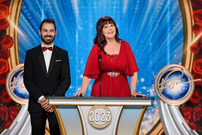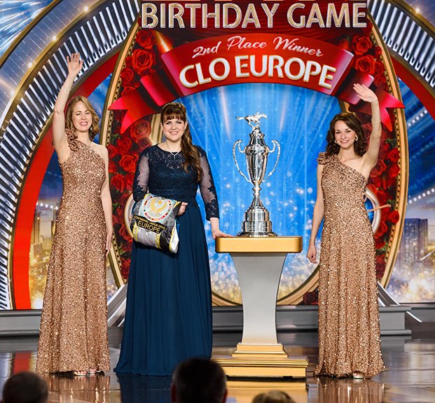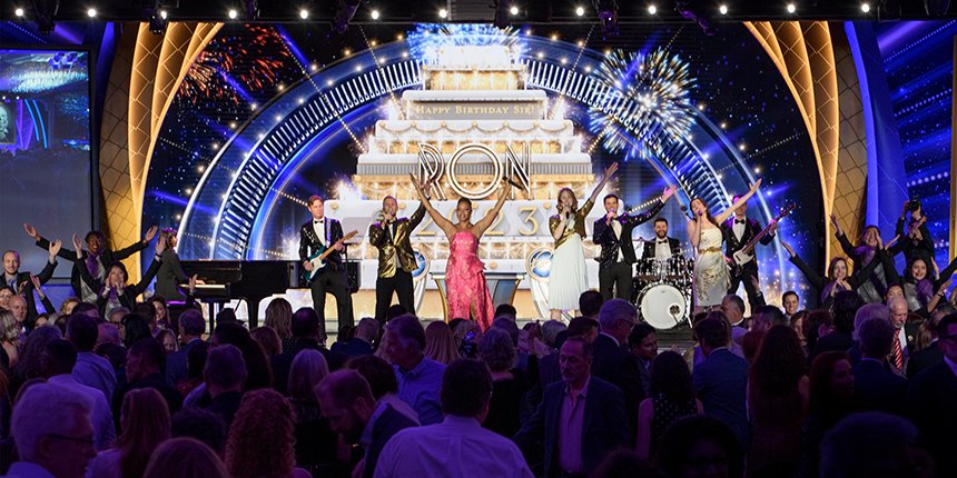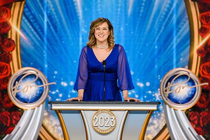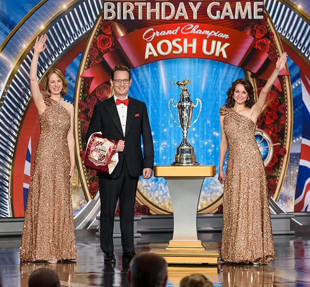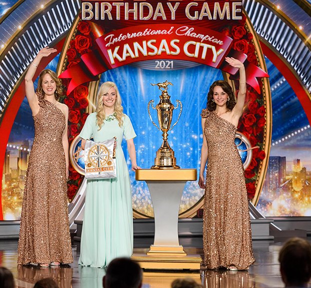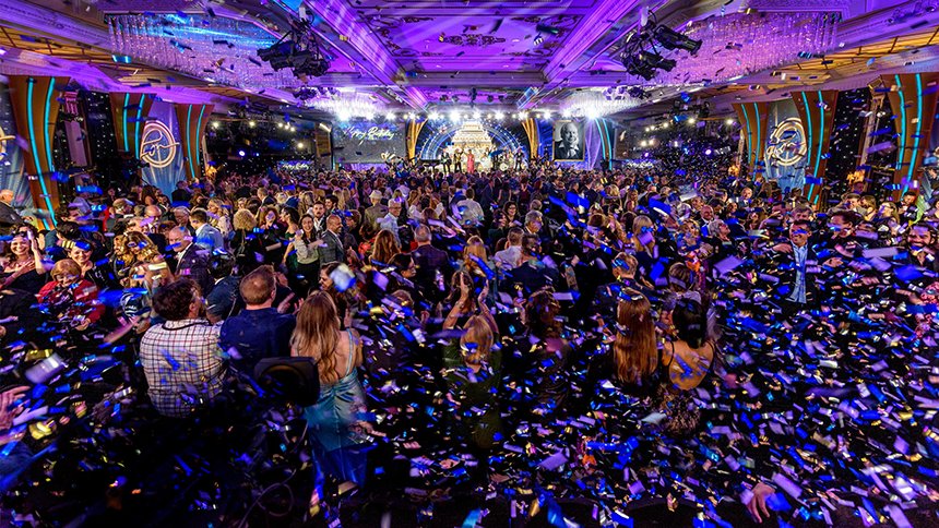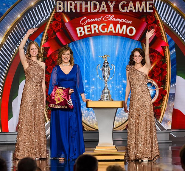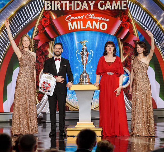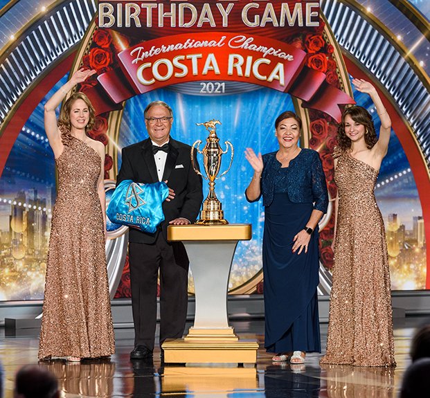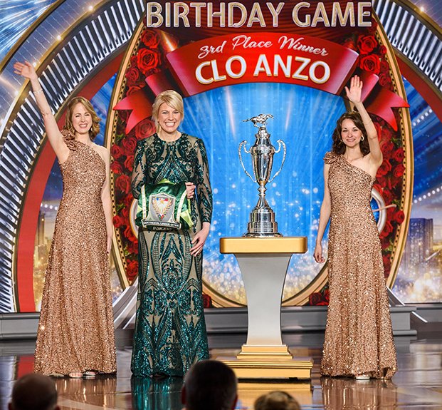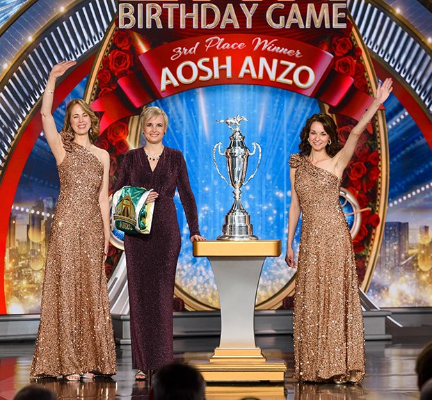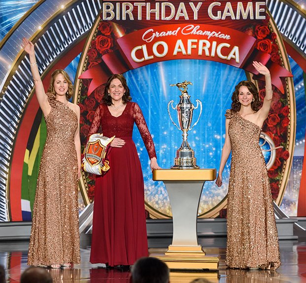 Después llegó el momento de anunciar a los campeones del Juego de Cumpleaños de LRH. El escenario se transformó en un círculo de ganadores rodeado de rosas, con brillantes luces, camisetas de seda y relucientes trofeos. El Juego de Cumpleaños sigue la tradición de honrar al Sr. Hubbard con el regalo de la expansión en cada una de las Iglesias de Scientology.