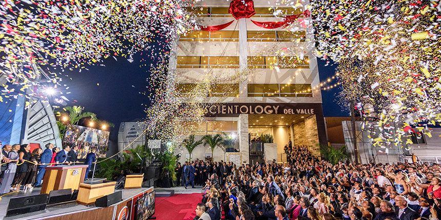 Solo seis días después, el Sr. Miscavige viajó 1600 kilómetros al sur hasta la Ciudad de México, la ciudad de habla hispana más grande de la Tierra, donde los mariachis cantaron serenatas para los que estaban reunidos. Bajo un cielo nocturno, el Sr. Miscavige homenajeó la Inauguración de la Org Ideal de Del Valle. El edificio de 12 pisos, con su rótulo iluminado de Scientology de más de 24 metros, se eleva por encima de la ciudad y se puede ver desde un kilómetro y medio en todas direcciones.