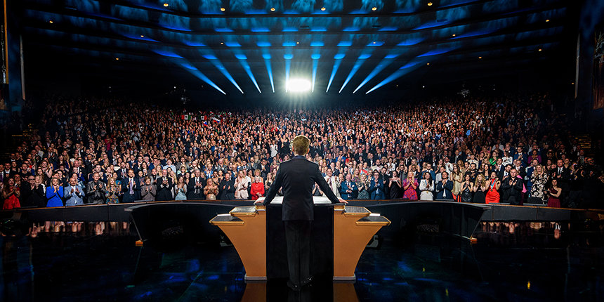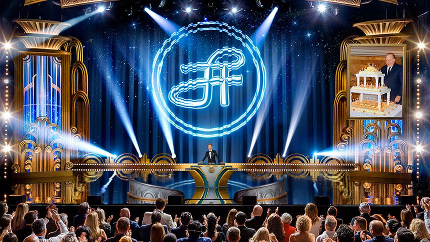 “Esta noche honramos a LRH: su vida, su legado, su historia y su herencia y, sobre todo, al hombre”, empezó el Sr. Miscavige. “Esta noche, por encima de todas las noches, LRH se nos acerca todavía más. O quizá somos nosotros los que nos acercamos más. Y así, entramos en el universo de LRH. Un lugar donde pasan cosas sorprendentes: donde hay una vela en su pastel de cumpleaños por cada ser humano en la Tierra; una tarjeta de cumpleaños por cada uno de los que están a punto de respirar por primera vez y una influencia global tan vasta, bueno, solo mirad alrededor, ¡Scientologists de no menos de 71 países están reunidos ahora mismo en esta sala!