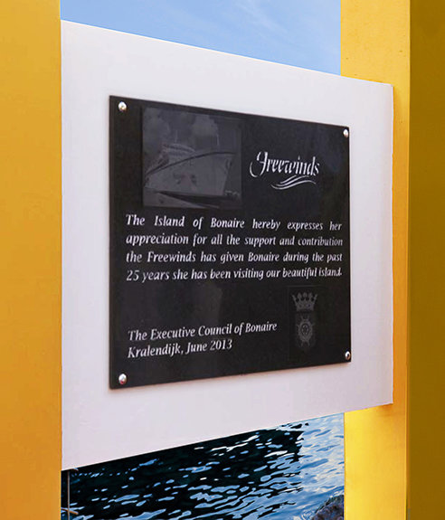 - Un monumento en el Puerto de Willemstad de Curazao, el puerto de origen del Freewinds, revelado por la oficina del Primer Ministro en honor a la estadía permanente del barco en la isla.