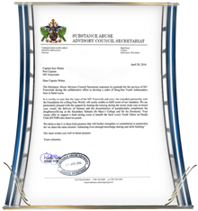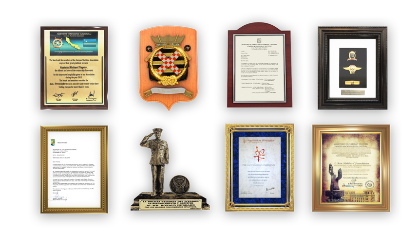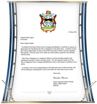 - La Comisión de la Policía Real de Antigua en reconocimiento de los casi 250 oficiales que ahora han sido educados en El Camino a la Felicidad obteniendo su promesa de aplicar esos preceptos para “inspirar [su] nación isla”.
