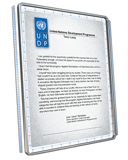- Y finalmente, a través de los programas patrocinados por la IAS dirigidos a un apoyo social a gran escala con El Camino a la Felicidad restaurando un espíritu de hermandad en la capital europea de Bruselas, Applied Scholastics extiende un salvavidas de alfabetización a los pueblos de Timor Orientar en el Pacífico Sur, y la rehabilitación de drogas de Narconon abre un sendero de exitosa rehabilitación en el estado de Florida.