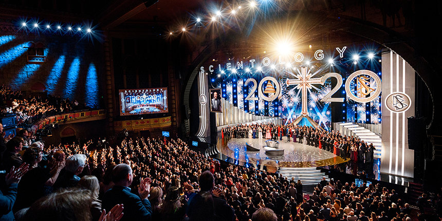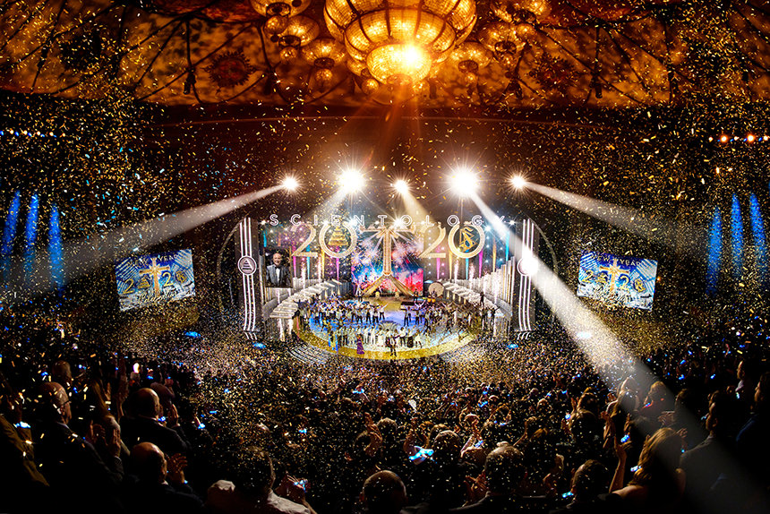 Más allá de los rascacielos brillantemente iluminados creando el paisaje urbano de Los Ángeles, el foco de atención brilla sobre el famoso Auditorio Shrine donde los Scientologists se reúnen para celebrar una década récord: