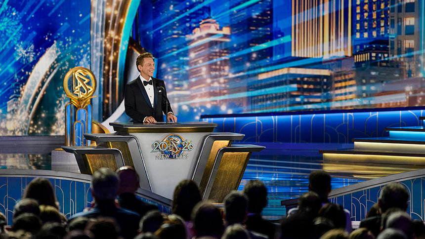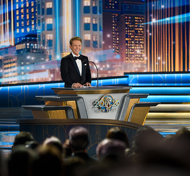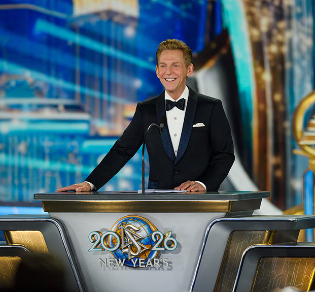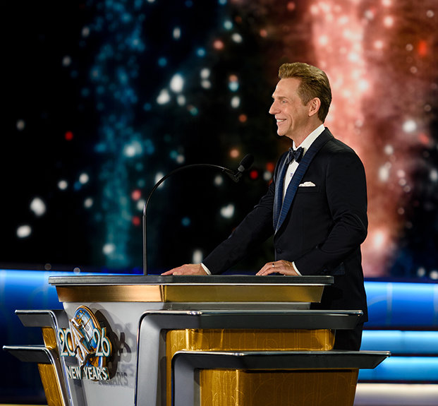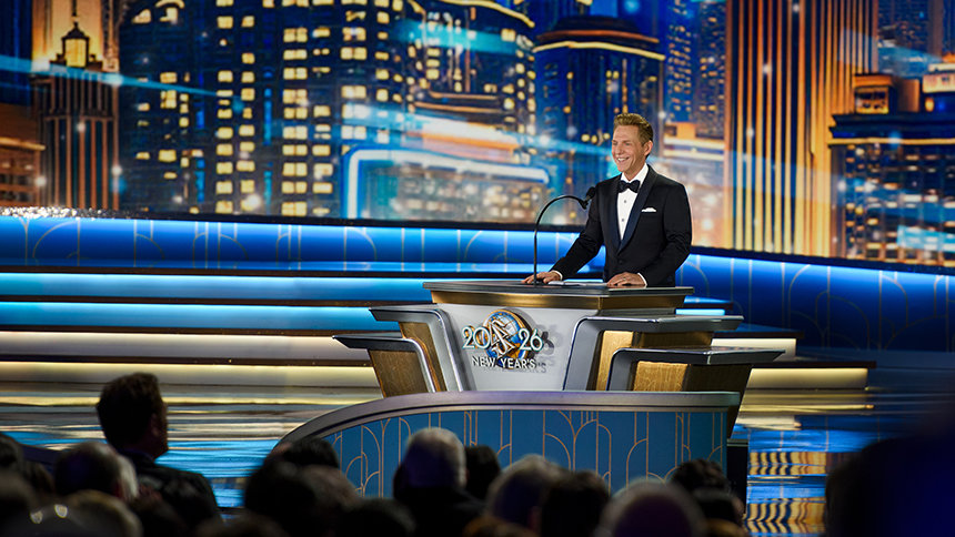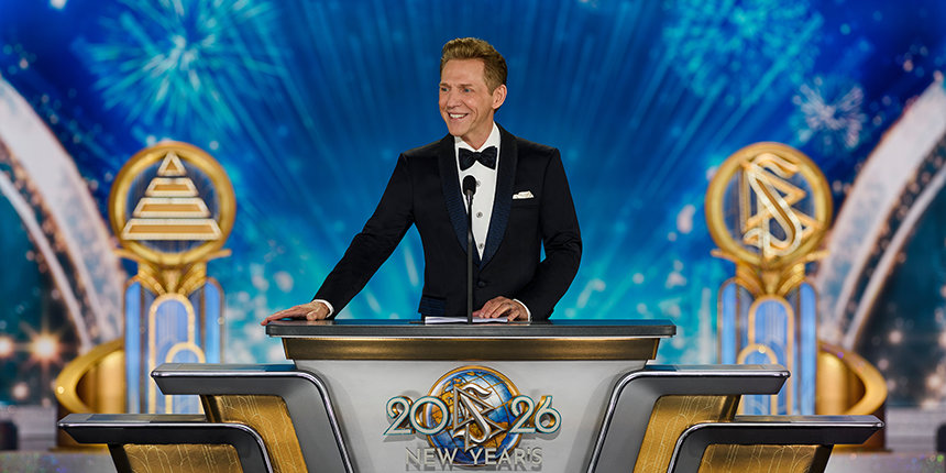 La velada alcanza su máxima intensidad cuando el Sr. David Miscavige, el líder eclesiástico de la religión de Scientology, aparece bajo los focos y la Celebración de Año Nuevo 2026 cobra vida.
